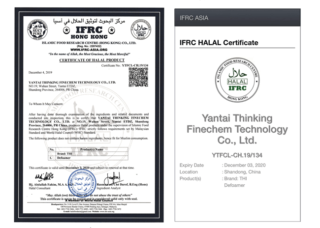 恒鑫化工消泡劑系列產(chǎn)品于2019年12月4日通過了HALAL認(rèn)證并取得了HALAL證書。清真認(rèn)證即HALAL認(rèn)證,符合穆斯林生活習(xí)慣和需求的食品、藥品、化妝品以及食品、藥品、化妝品添加劑。